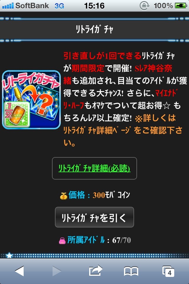リトライ自体は無料なのだろうと思いますが、リトライ時にのみ登場するアイドルとかあったらリトライが捗りそうですね。