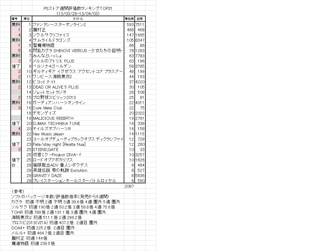 PSO2は先週より増。2-3週間後でヨクサル抜いて評価数1位へ?